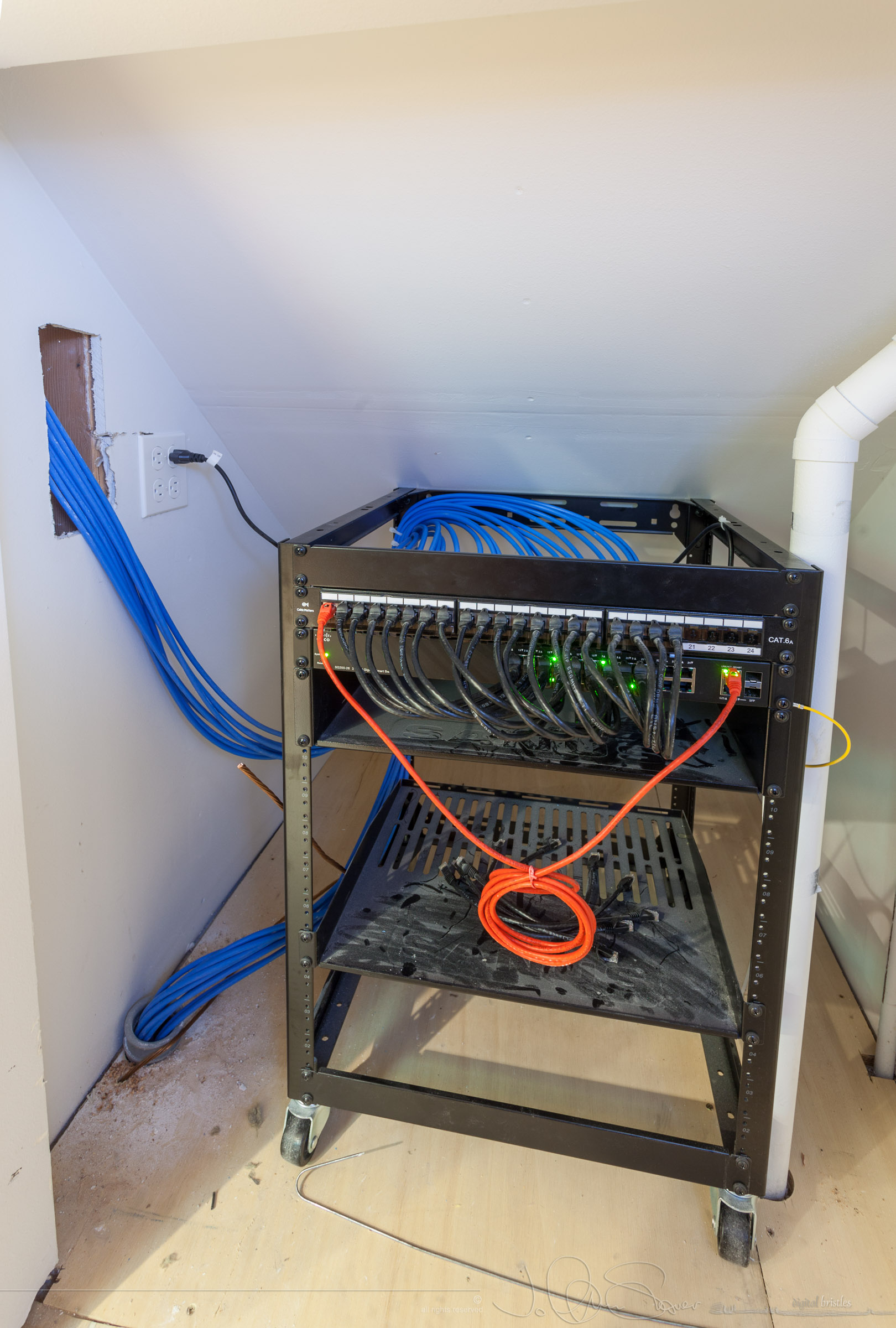 Galleries2015 remodel150825_0021.jpg Network closet under the back stairs. One bundle for upstairs, the other for the crawl space